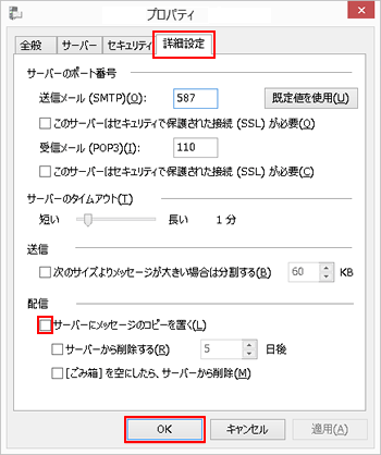 「詳細設定」タブを選択して配信の下の、「サーバーにメッセージのコピーを置く」からチェックを外します。