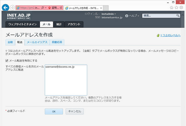 「メール転送を有効にする」のチェックボックスをオンにすると、メール転送が可能になります。