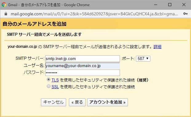 通常、Gmail から送信したメールの差出人アドレスは@gmail.comとなりますが、以下の設定を行うことにより、INET-MAIL で作成したご自身のメールアドレスが使用できるようになります。