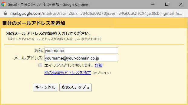「エイリアスとして扱います」のチェックはオンにして「次のステップ>>」を押してください。